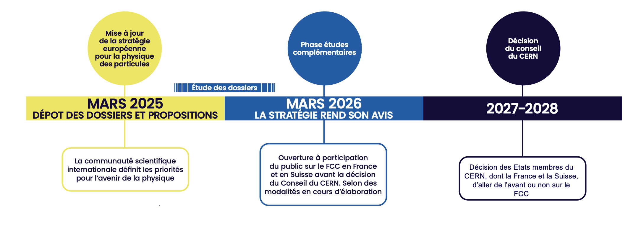 L’étude de faisabilité du FCC a été lancée pour faire suite aux recommandations de la mise à jour 2020 de la stratégie européenne pour la physique des particules, et servira de contribution au processus de mise à jour de la stratégie, actuellement en cours, aux côtés d’études d’autres projets proposés par la communauté scientifique.